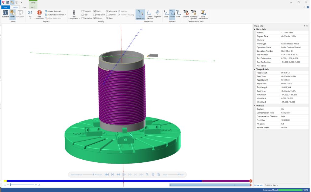 The part, a hoist drum, employs a wire rope or cable to lift or lower loads. The grooves keep steel cables from overlapping, potentially damaging the cable, and prevent inconsistent lift and lowering of objects. Due to its size, the drum was machined on a large VTL. The selected toolpath is not limited to vertical machining and can just as easily be performed on a horizontal lathe. In this case, the machinist cut a left-hand spiral, so the tool engaged in the cut from the bottom to the top to produce the shape.