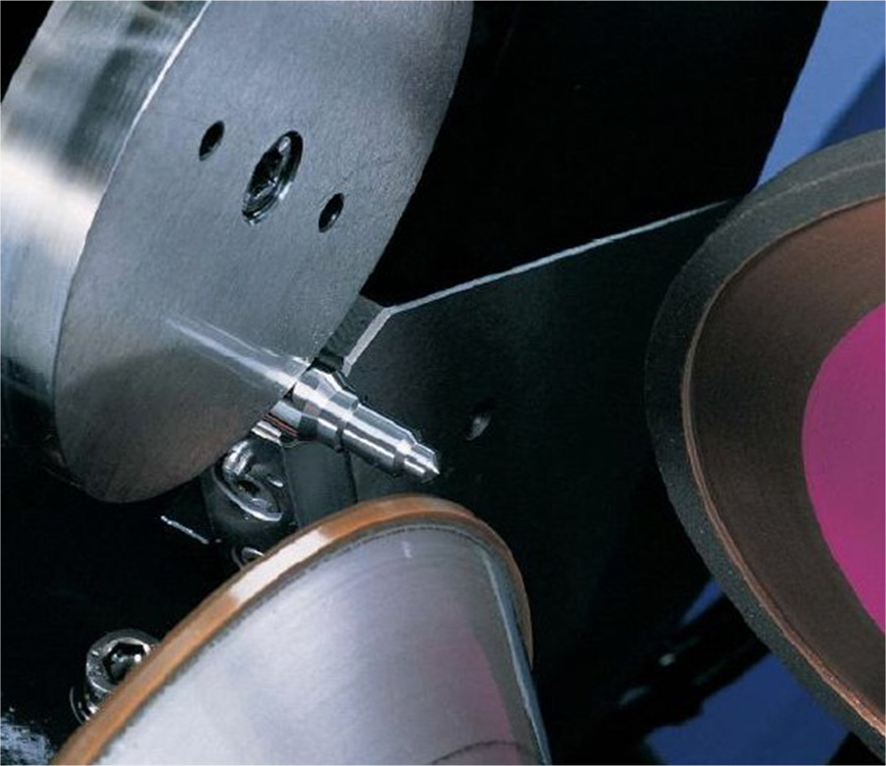 To excel in a competitive industry and in response to marketplace demands, Rollomatic has patented pinch grinding using its ShapeSmart grinders to reduce the number of operations required in blank preparation and to reduce lead times. Pinch grinding is a variation of peel grinding, which refers to high-speed grinding wheel is fed into the outside surface in controlled relation to the axis of rotation. Th…" title="Grinding operation in which the workpiece is rotated around a fixed axis while the grinding wheel is fed into the outside surface in controlled relation to the axis of rotation. Th…" aria-label="Glossary: cylindrical grinding">cylindrical grinding of rotating blanks. In pinch grinding, however, the blank simultaneously passes through two opposing wheels: a roughing wheel and a finishing wheel.