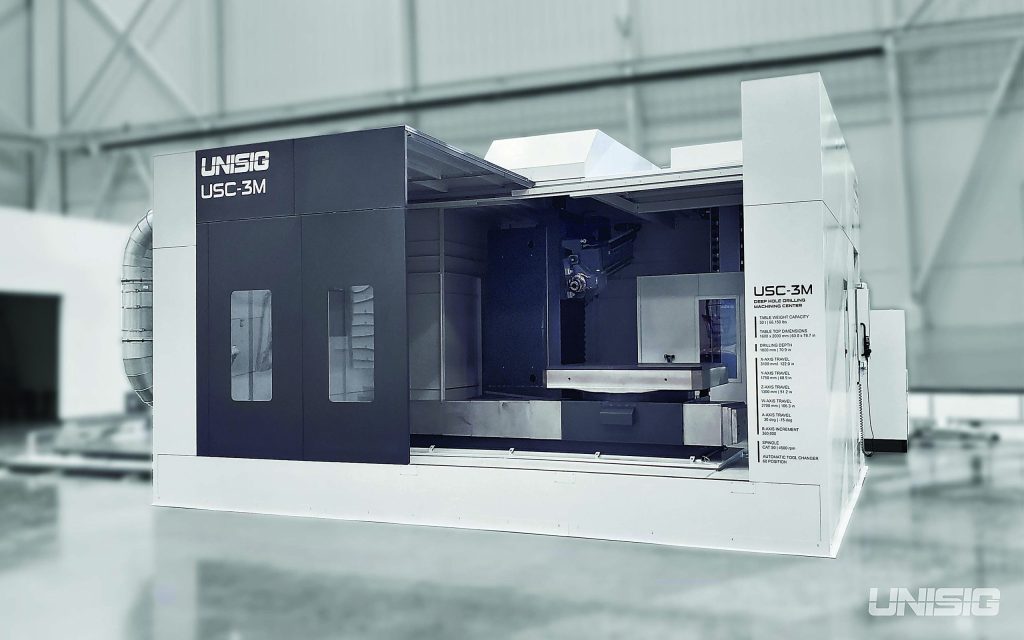 Built around a universal CAT 50 spindle that offers up to 40 hp, the USC-2M and 3M feature high-performance milling combined with UNISIG's industry-leading indexable gundrill technology for outstanding material removal rates. Additionally, a 60-position automatic tool changer further minimizes nonproductive time to keep parts moving, and programmable pumping systems that maximize the performance of water-soluble coolant.