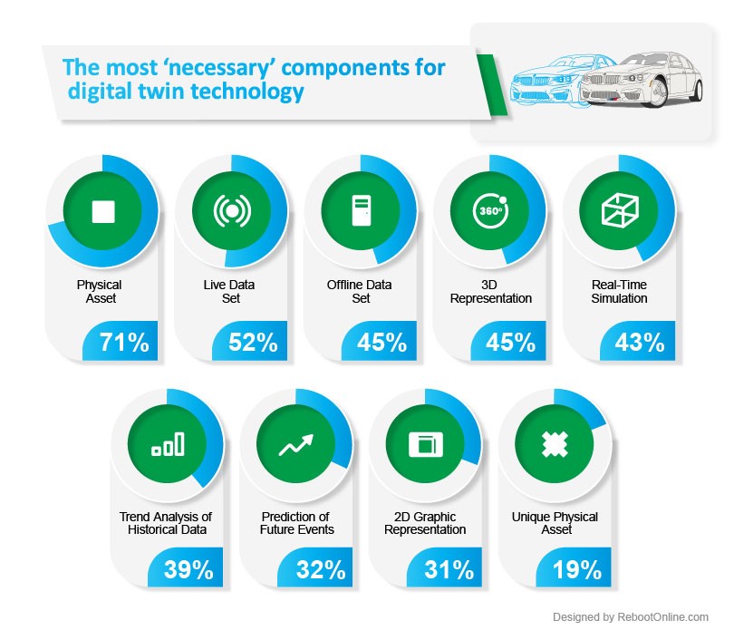 Reboot Online found that a "physical asset" (71 percent) is the component engineers think is the most necessary for a digital twin. Thereafter, 52 percent of the experts view a "live data set" as an essential feature for the functionality of digital twins, and 45 percent also believe an "offline data set" is a very important component for the technology.