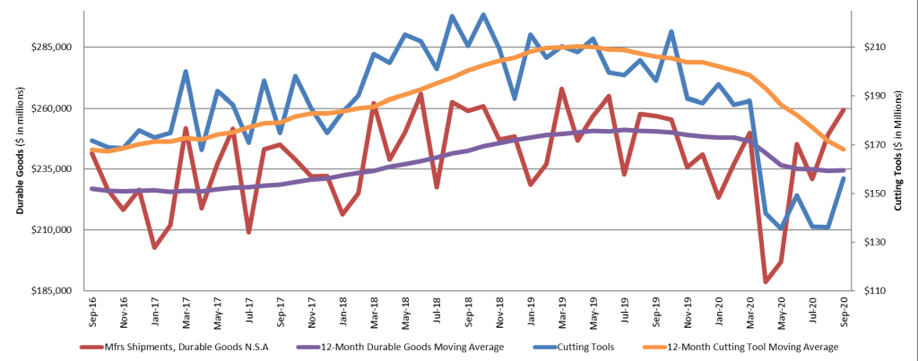 This total, as reported by companies participating in the Cutting Tool Market Report collaboration, was up 14.7 percent from August's $136.1 million and down 20.5 percent when compared with the $196.3 million reported for September 2019. With a year-to-date total of $1.4 billion, 2020 is