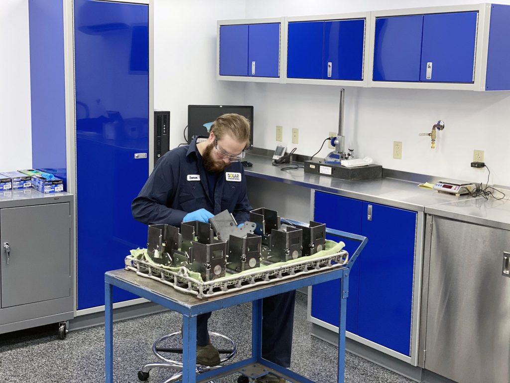 The temperature- and humidity-controlled room provides a clean environment for the critical assembly and alloying methods employed by Solar. All inventories of the clean components for final assemblies will be safely stored within the new space.