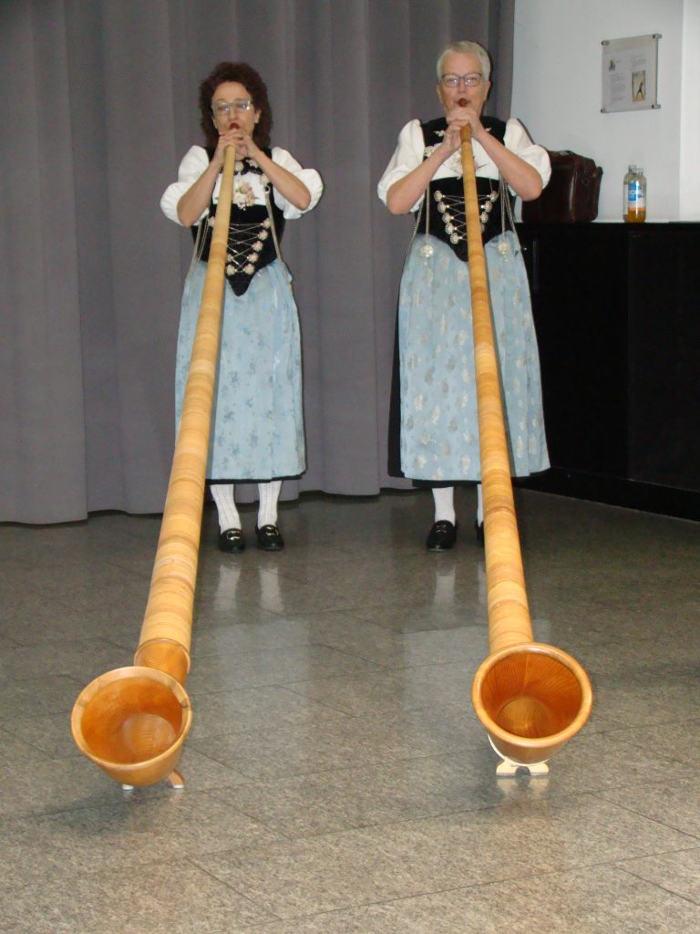Musicians present Swiss culture at this year’s Studer press conference by playing alphorn melodies.