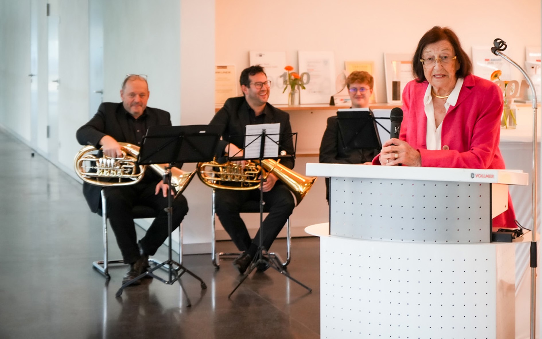 The event featured musical performances by a tuba quartet, songs from the Biberach city band, as well as a salute by the city's militia. Actors of a local, traditional theater performed a small play, as Fräulein Vollmer had once participated in the theater as a young girl. The laudatory speech was delivered by Martin Kapp, chairman of the supervisory board of the Vollmer Group, who highlighted not only her achievements for the company but also paid tribute to her as a person.