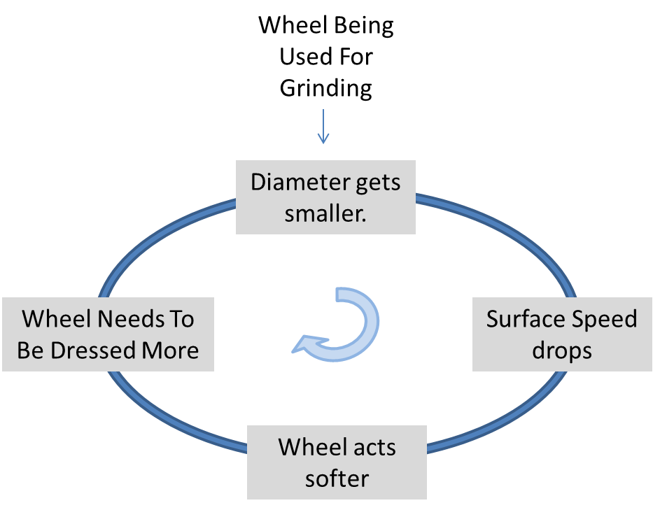 This is especially true on older machines and manual grinders where the machine typically does not compensate for wear and the spindle speed is constant, meaning the "softening" of the wheel will continue and increase, as the diameter approaches stub. However, if the grinder does compensate for wear and adjusts the spindle speed to maintain a constant surface speed, this softening is somewhat mitigated.