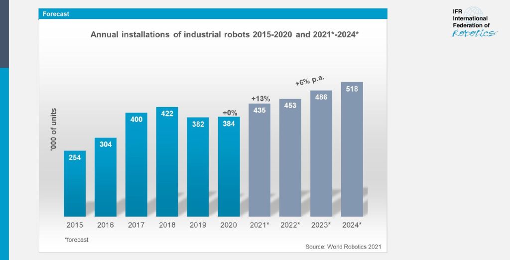 The World Robotics 2021 Industrial Robots report shows a record of 3 million industrial robots operating in factories around the world – an increase of 10%.