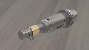 The SOLO L uses two centrifugal weights installed in a sealed tool head. With an activation speed rate of 1600 rpm or higher, the weights start moving outwards and turn the gearwheel, which drives the blade out by rotating the blade control. When the spindle is stopped and then actuated to cutting speeds, a pullback spring pushes the centrifugal weights back to the center and the blade extends to the cutting diameter. Maximum machining speed is 900 rpm.