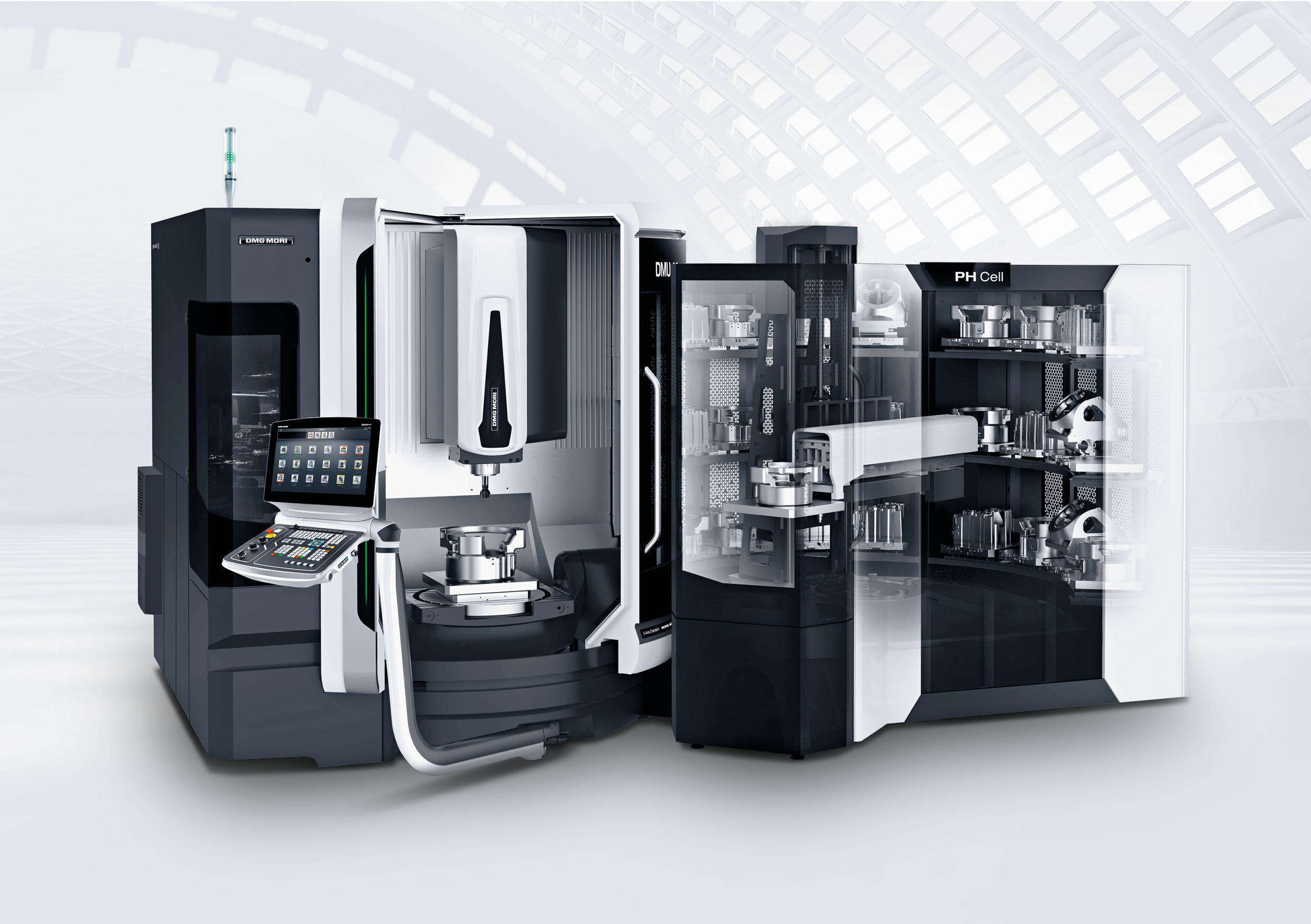 A new PH Cell pallet system with a footprint of 10.7 m² from DMG MORI is available for the DMU 65 monoBLOCK machine. The side loading into the machine tool guarantees optimal ergonomics and accessibility to the workspace.