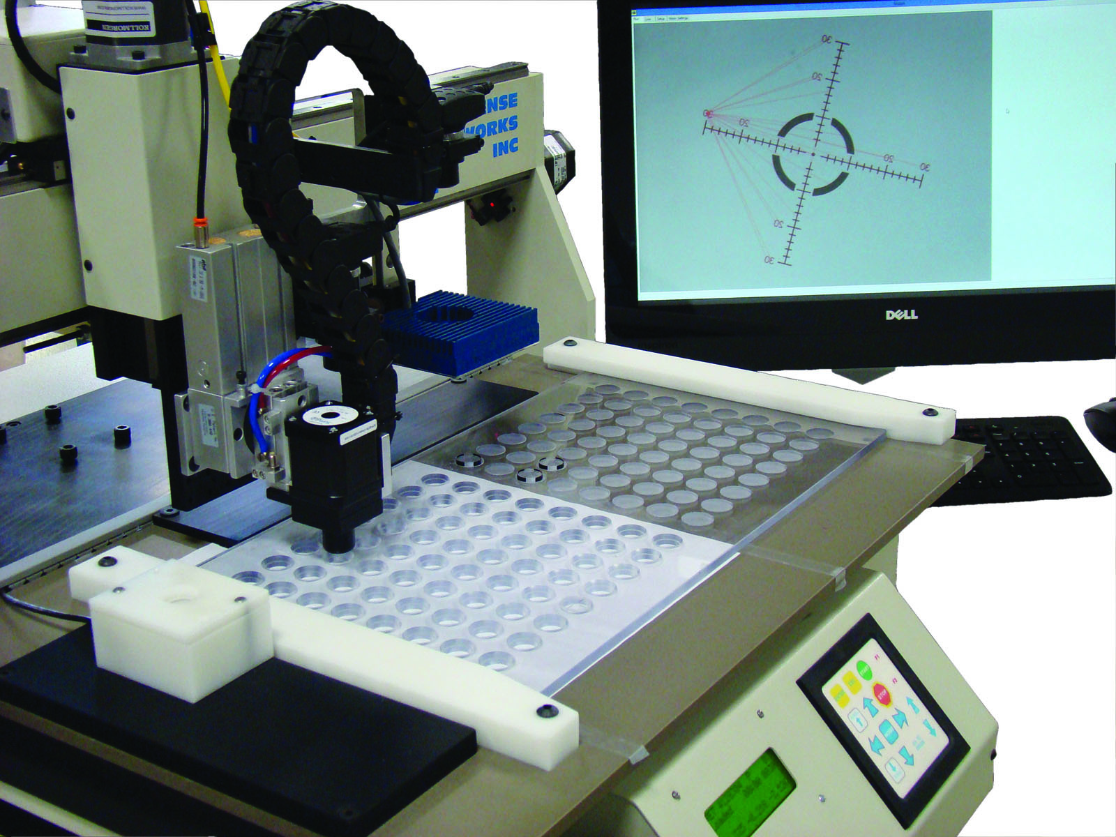 The Dispense Works Inc. RP series robotic dispensing system with an optional vision guided system performs pattern recognition and edge and hole detection for simpler setup and fixturing, while assuring repeatability from part to part. The robot takes a picture of the part, does any necessary offsets and adjusts its program for precise dispensing and part placement.