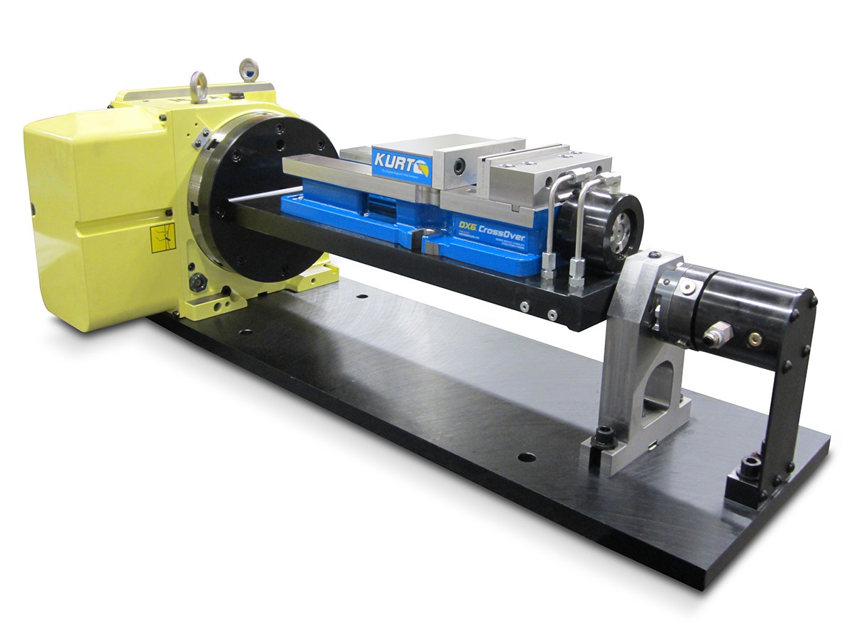 The Kurt newly designed rotary table workholding system is designed using the Kurt DX6 CrossOver hydraulic vise with a trunnion mounted onto a 4-axis rotary table. The system uses double-acting hydraulics, which is desirable for automated part loading and unloading via a robotic system. Additionally, the system can be used for manual part loading and unloading.