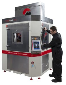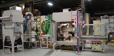 Guyson Corp. has designed and built a robotic grit-blasting machine that is specially adapted for processing aircraft turbine blades in production lots.