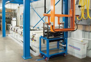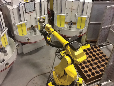 Guyson Corp. has engineered and built a work cell for grit-blast descaling of forged automotive components with three automated blasting machines that are loaded and unloaded by a vision-guided material handling robot.