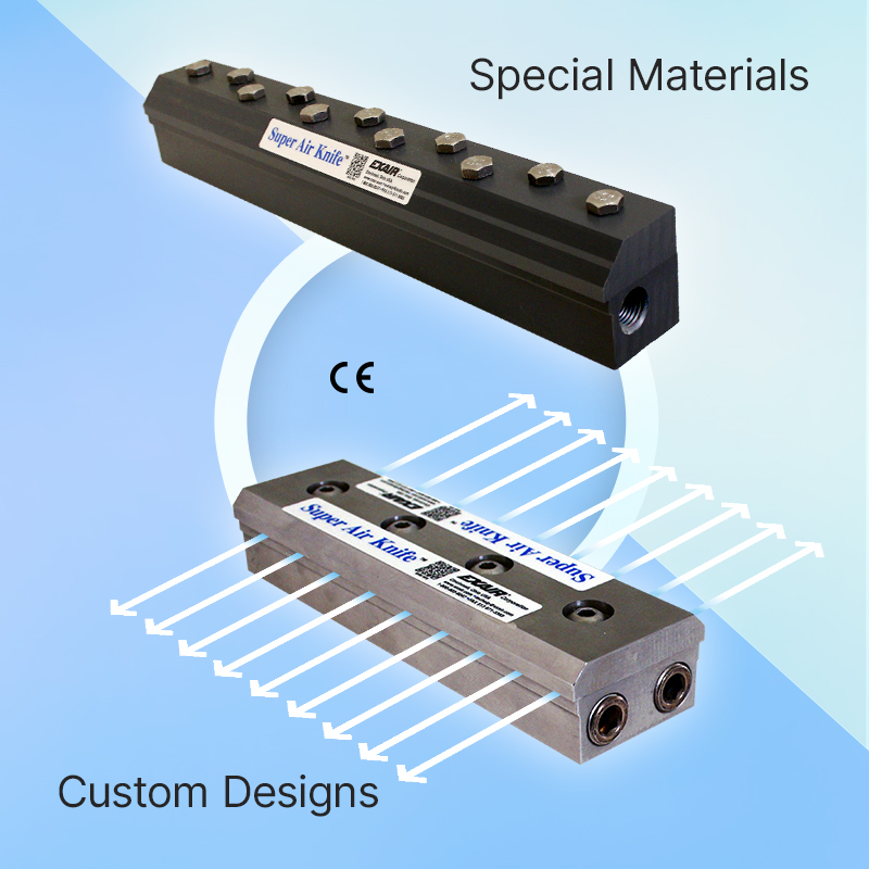 For applications where stock aluminum, stainless steel or PVDF won't work, other material options such as CPVC or glass filled PEEK thermoplastic have been used. Special marking requirements for tying knives to specific machines or critical processes can be accommodated. Unique shapes and profiles, such as double sided or curved Air Knives, can also be the solution to certain specialized processes.