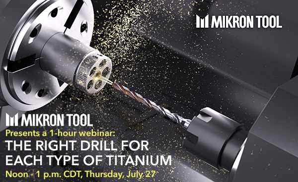 Not all titanium is alike. Depending on whether it is pure titanium or alloyed titanium, the chip removing process behavior differs. For these challenges, Mikron Tool has developed drills tailored to specific titanium grades that can machine titanium safely — with higher cutting performance results, longer tool lives and excellent hole quality. The webinar, which is presented by Clive Komlenic, sales director, East, for Mikron Tool, addresses chip formation, torque, material properties, overheating and Mikron's latest state-of-art drill series technologies aimed at machining titanium.
