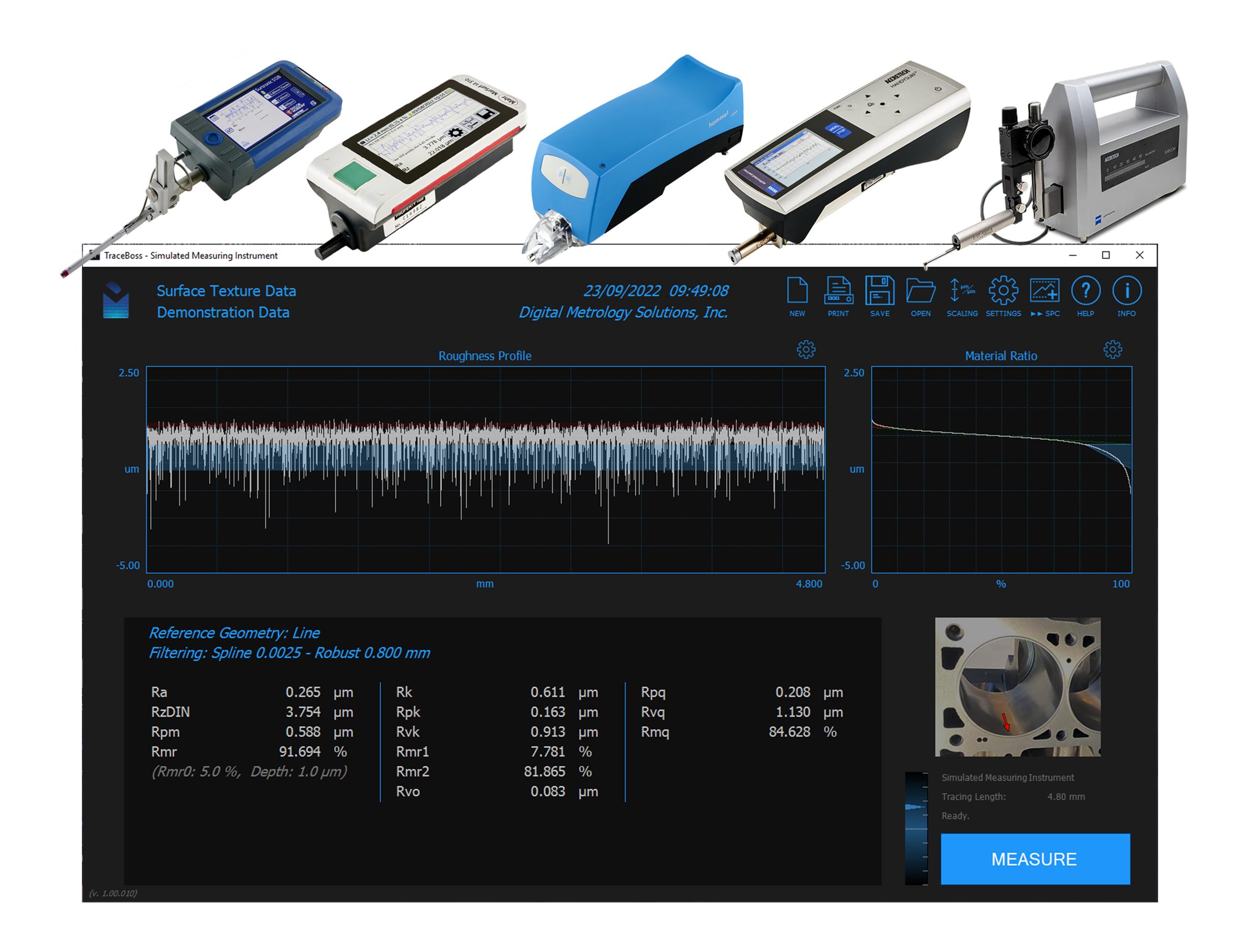 The TraceBoss software interfaces with most portable surface roughness gages via a USB connection. One click in TraceBoss configures the gage, initiates a measurement, and presents the results and graphics full screen and in high resolution. The software display is optimized for the highest visibility in shop environments.