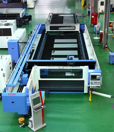 The FS8025 flying-optic CO<sub>2</sub> laser cutting system from Han-Kwang USA Inc. is its largest model to date. The system has dual shuttle tables, each measuring 26' long × 8' wide. The cutting head can cover an entire worktable area without repositioning the table in process, according to the company.