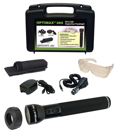 The Spectroline OPTIMAX 365 from Spectronics is a cordless, rechargeable UV-A (365 nm) LED flashlight that is for nondestructive testing applications such as MPI, FPI and general fluorescent examination.