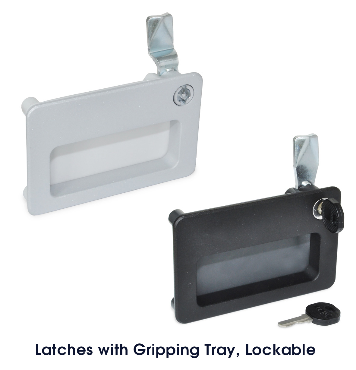 J.W. Winco Inc. offers GN 115.10 latches with gripping tray, lockable, in metric sizes. These RoHS-compliant latches with gripping tray are used in applications that require a molded recess in addition to the latching mechanism, e.g. if operating elements are not allowed to protrude for reasons of space.