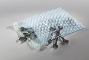 Using Vapor phase Corrosion Inhibitor (VpCI®) technology, the bubbles protect a variety of metals, including carbon steel, aluminum, copper, brass, silver and stainless steels, without leaving film or residue on packaged items. CorShield® Bubble Bags are non-toxic and recyclable. Components that need protection are placed in the bags and in matter of hours, the vapor from the VpCI® bubbles saturates the enclosed airspace.