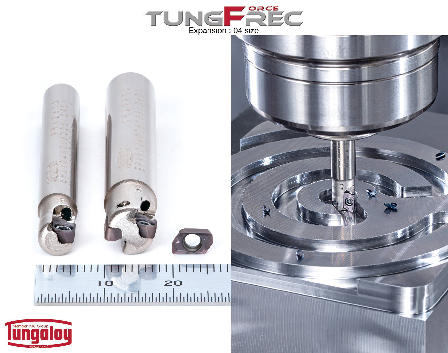 The small size-04 inserts also allow TungForce-Rec04 to have a higher teeth density than conventional shoulder cutters of the same size, boasting two teeth for an 8 mm diameter cutter and three for a 10 mm. This allows TungForce-Rec04 to run higher feed speed than competitors when being fed at the same rate per tooth, enabling increased productivity.