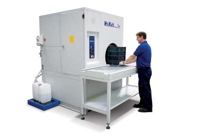 CleanVeyor ultrasonic parts washer from Cleaning Technologies Group LLC utilizes a combination of spray, immersion, and ultrasonic cleaning technologies and has proven successful in achieving Six Sigma consistency in a number of applications requiring high production outputs and tight cleanliness levels.