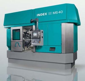 The new INDEX MS40P CNC multi-spindle automatic lathe includes a quillstock with six tool carriers and one counter spindle opposite the main 6-spindle drum, making it possible to machine complex workpieces requiring many tools with highest precision in a single process.