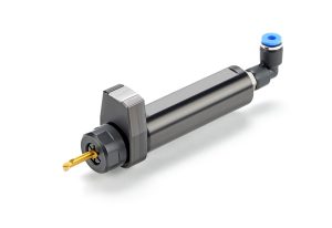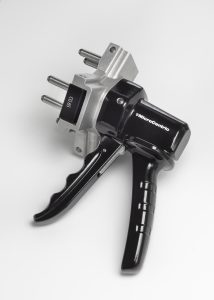 The pistol grip changing fixture is easiest way to change MicroCentric collets. Simply insert the pins onto the front face of the collet and squeeze the handle. A locking mechanism in the handle keeps the fixture collapsed while installing and removing the collet.