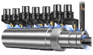TungBore-Mini is a multifunctional drilling and turning tool line that integrates the capabilities of drilling, OD, and ID turning tools. Its unique XOMU insert features an innovative geometry incorporating a large inclination angle on the cutting edge that produces light cutting, compared with standard ISO positive turning inserts that are typically used for ID turning or boring operations. In addition, TungBore-Mini's insert and pocket have a dovetail interlocking design providing better insert clamping and stability than standard screw-down insert clamping, ensuring process security during various applications.