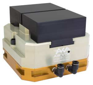 A key benefit of this vise is the simple solution it provides for integrating automated machine tending into your machine shop. Air Vise offers an electric kit that allows a cobot/robot the ability to open and close the vise by controlling the air flow. By controlling the vise the robot can place intricate and uniquely shaped parts at ease. The table vise is equipped with quick change jaws that allow jobs to be switched in a breeze. A job can be switched over in a matter of minutes by simply selecting the new jaws and mill program.n