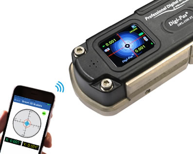 Digi-Pas 2-Axis SMART Machinist Level wirelessly displays both X and Y leveling status on a smartphone or laptop PC while you simultaneously adjusting machine's footings on the floor over Bluetooth range. This greatly cuts downtime and improves quality of installation, setup and maintenance of machines . Digi-Pas 2-axis precision level replaces two units of old-fashioned spirit levels and single-axis Inclinometers.