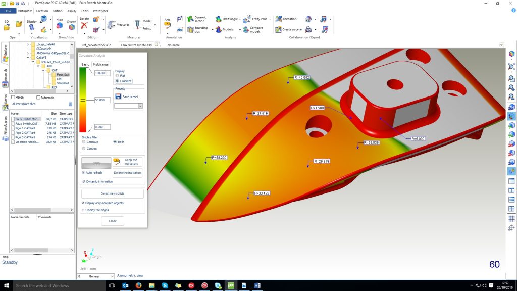 As well as the enhancements to the translators, updates have been made to PartXplore 2017 R1's curvature analysis. The object being analyzed can now be displayed with colors corresponding to curvature radius values defined as ranges. New radius values can be added and edited interactively, and colors can be displayed in either flat or gradient mode.