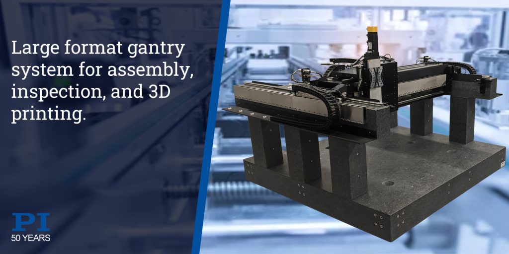 Precision motion control and nano-positioning industry leader, PI, introduces a new high performance gantry stage system, further increasing its gantry linear robot product family. The A-352 direct-oridrive gantry covers overhead motion ranges up to 2x1 meters and is based on a total of 3 direct-drive, closed-loop, brushless linear motors. Guided by high load mechanical linear bearings, it is ready for demanding 24/7 industrial automation applications. For maximum uptime and accuracy, absolute measuring linear encoders are integrated making homing procedures unnecessary and eliminating the possibility of dropped encoder counts from incrementally operating encoders. The ironless 3-phase linear motors are free of cogging, for improved velocity control and constancy – important for laser machining and digital printing applications.