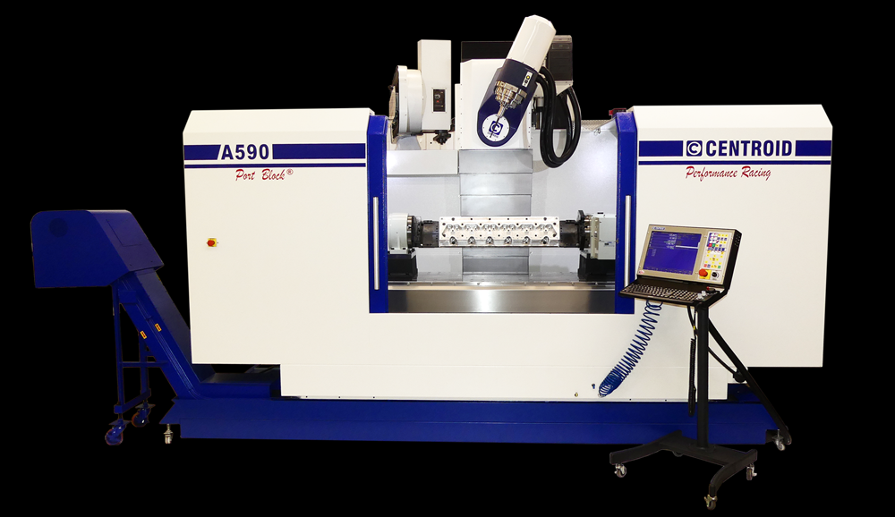 The A590 is a 23,000-lb. cylinder head porting and block machining center for big billet and diesel work. Whether you need to port long V12 or diesel cylinder heads, have a large production volume of heads to port, or have a specialty application requiring extreme angles, the CENTROID A590 is suitable.