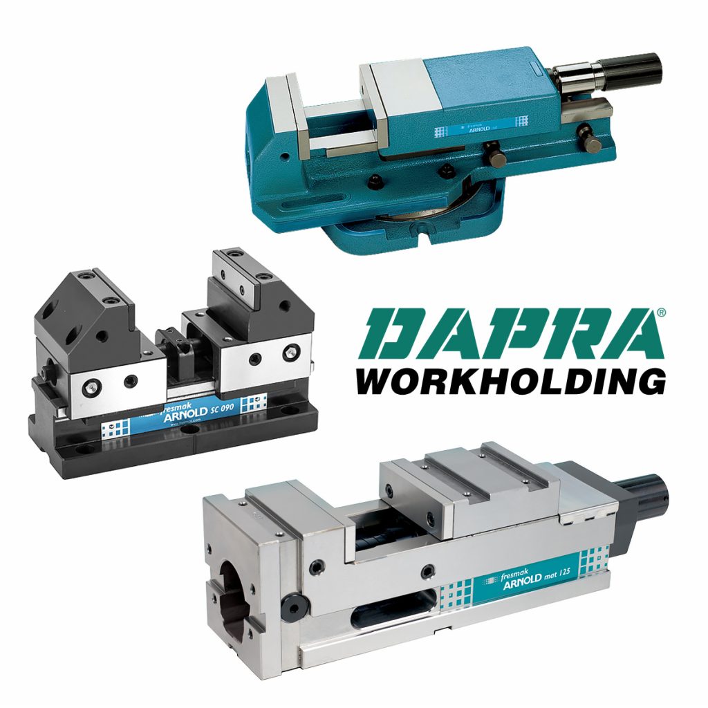 Dapra Corp. offers a full line of Arnold high-pressure vises that provide controllable power and dependable clamping for a variety of workholding applications. The Arnold family of vises, manufactured by world leader Fresmak, includes durable solutions that are suitable for milling, grinding, drilling, toolroom and production work.
