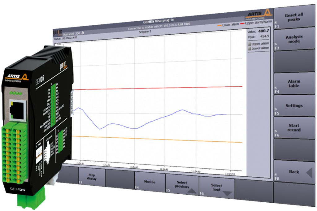 The GEMDS system consists of an eddy current sensor, an amplifier, a connecting cable and the GEMDS monitoring module. It can monitor four different sensor signals – one for displacement and three for temperature – providing real-time feedback on critical variations. It has a measuring range of 550 µm and precision down to +0.2 µm.