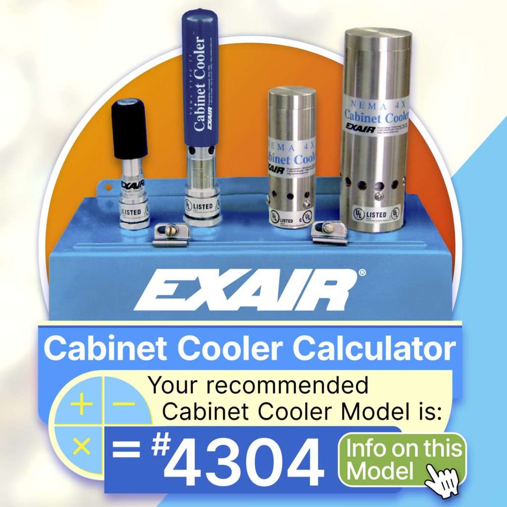 EXAIR's complete line of Cabinet Cooler systems include 120V AC, 240V AC and 24V DC thermostat voltage, continuous operation, type 316 stainless steel and high temperature models – all of which are selectable with the new calculator. Find this new tool on the website EXAIR.com, in the Knowledge Base Calculators, along with many other resources, such as the CAD Library and Application Database, which also help customers choose a perfect solution.