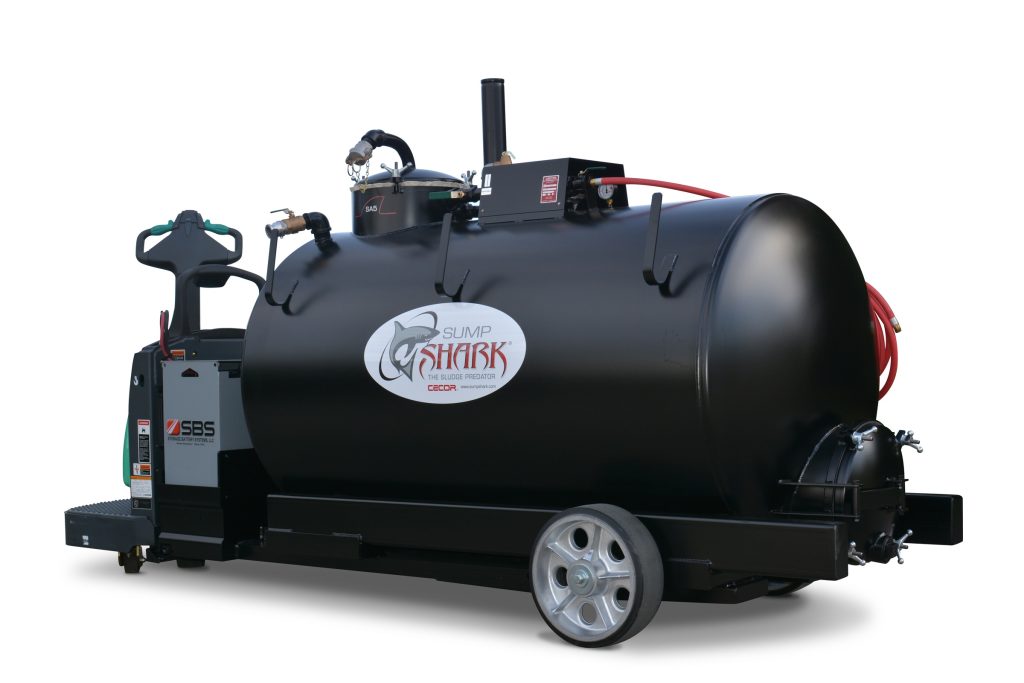 Move a sump cleaner safely through plant between collection, treatment or disposal with CB6 walk/ride transport base from CECOR. Sump cleaner is mounted on a battery-powered pallet truck with stand-on platform for easy driving.