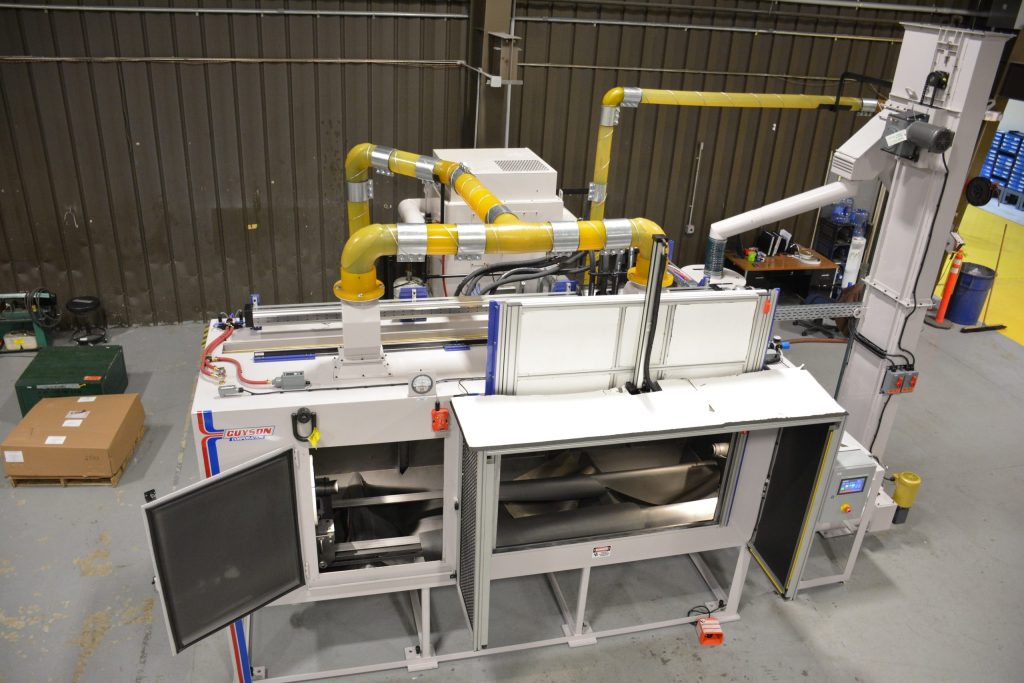 The reclaim is equipped with a 300/28 cyclone separator with 6.5 cubic foot pressure media delivery. The cyclone reclamator provides media separation, consent downward flow of shop air ensuring good visibility and reduces the possibility of particle contamination. To balance the reclaim and ensure negative pressure in the finishing enclosure a D-2000 dust collection system was selected.