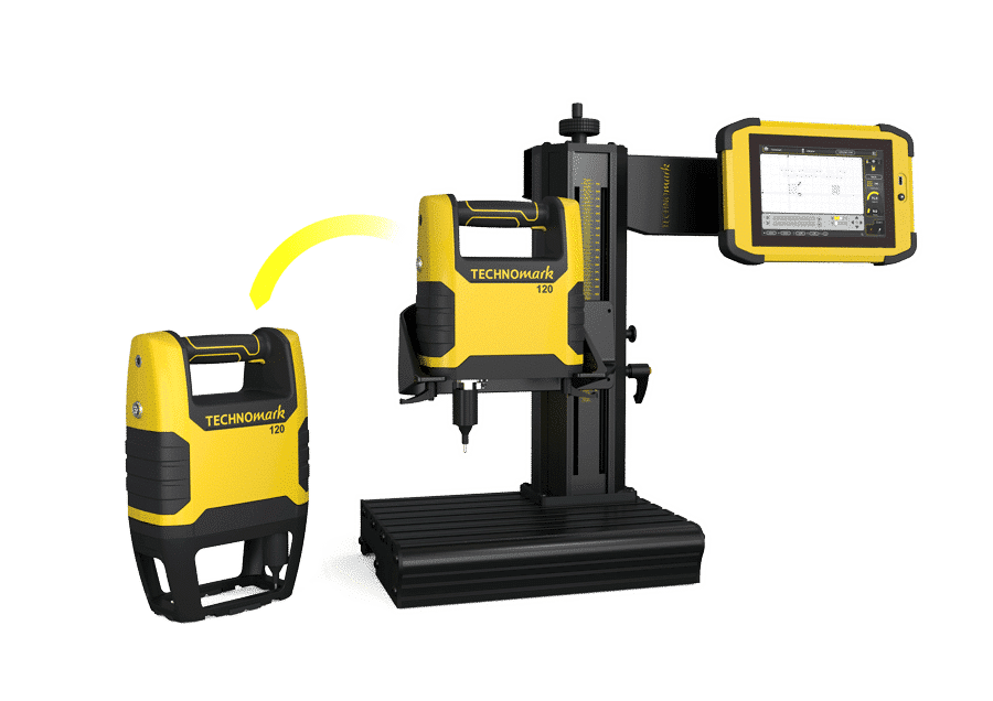 The Combo model fits to all users needs and allows the switch from portable to a benchtop mode in less than 10 seconds. It is equipped with an ergonomic and universal mounting base to make easy and quick height adjustments. It also allows to fix various universal clamping systems. Only available with a marking window of 120*60mm, this model is suitable with a roraty axis to make circumferential markings.