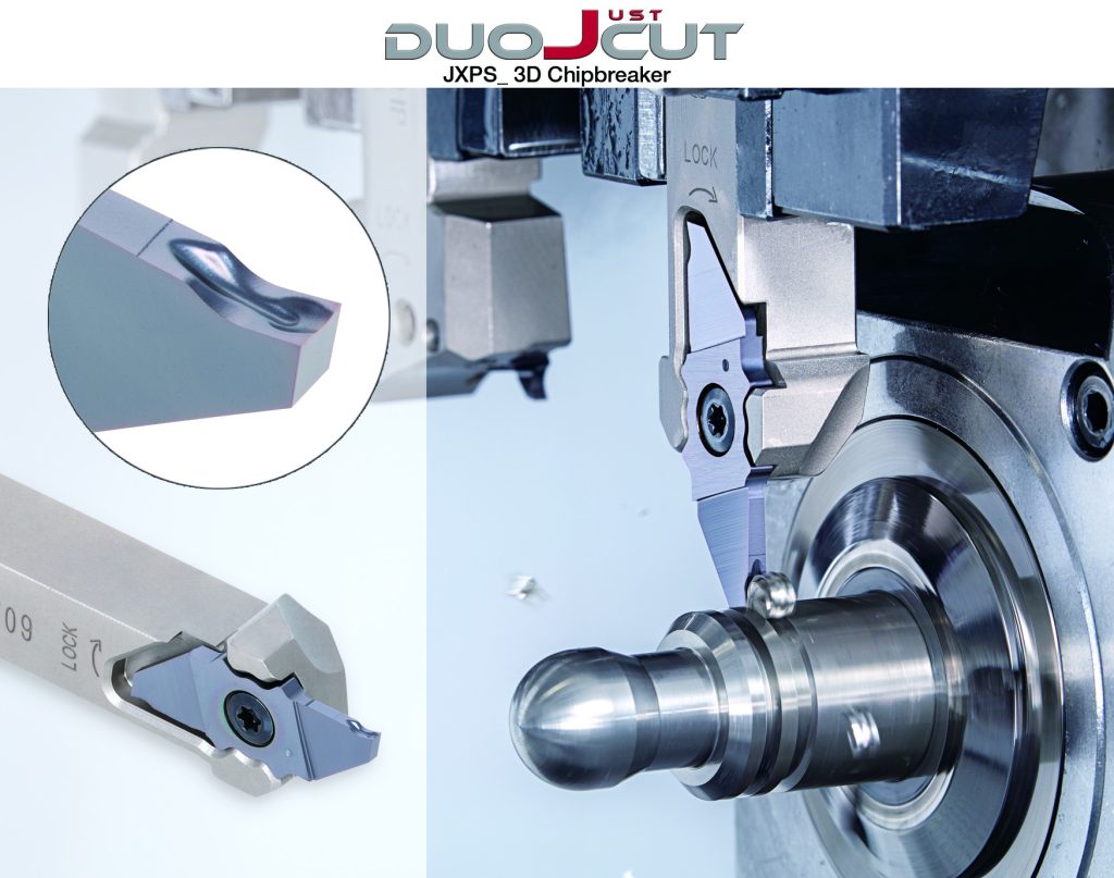DuoJust-Cut features innovative insert clamping ensuring tool rigidity and stability in various parting operations. In addition to existing JXPG insert with a ground in chipbreaker on the rake face, the new JXPS insert incorporates a 3D chipbreaker pressed in to its "dual-rake" cutting edge which is designed to promote optimal chip control and evacuation without compromising surface integrity.