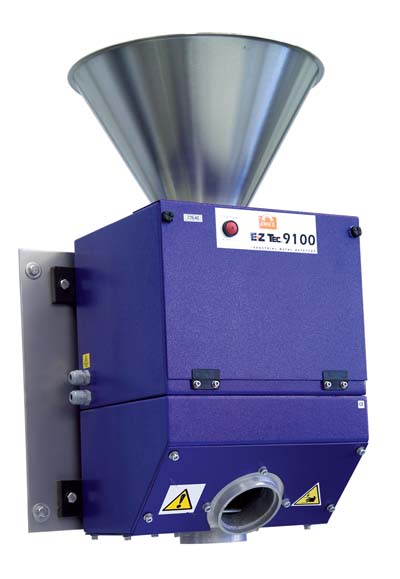 This compact metal detector is designed for installation in free fall or gravity fed applications, especially where space is limited. The E-Z Tec 9100 incorporates balanced coil technology and offers a higher sensitivity compared to other metal separators. It ensures detection and rejection of very small ferrous, nonferrous and stainless steel metals. The E-Z Tec 9100 offers a high-speed, air operated rejection system to minimize good product waste. This state-of-the-art metal detector/separator is used to reject metal contaminated material, or as a final quality check device.