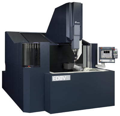 The EDBV8 offers X-, Y-, Z- and W-axis travels of 800mm, 600mm, 750mm and 500mm (31.5 inches, 23.6 inches, 29.5 inches and 19.7 inches), respectively. The machine is also equipped with a 2-axis rotary table that can accommodate a maximum workpiece size of 500mm (19.7 inches) diameter by 635mm (24.96 inches) long, and a maximum payload of 150 kg (330 lbs.). Its rotating C-axis head features an EROWA compact chuck that enables automatic changing of electrode diameters from 0.2mm (0.008 inches) up to 6.0mm (0.236 inches) with rotation speeds up to 1,000 rpm. The EDBV8 uses a rigid guide-arm assembly to hold, locate and support the die guide, which can be alternately used as a programmable axis (W-axis) that runs parallel to the Z-axis. An integrated "middle guide" system is also contained within the W-axis and is used with long small-diameter electrodes to prevent whipping, bending and vibration of the electrode. Additionally, the middle-guide "fingers" automatically retract as the electrode tube reduces in length, maximizing the productive useful length of the consumed electrode.