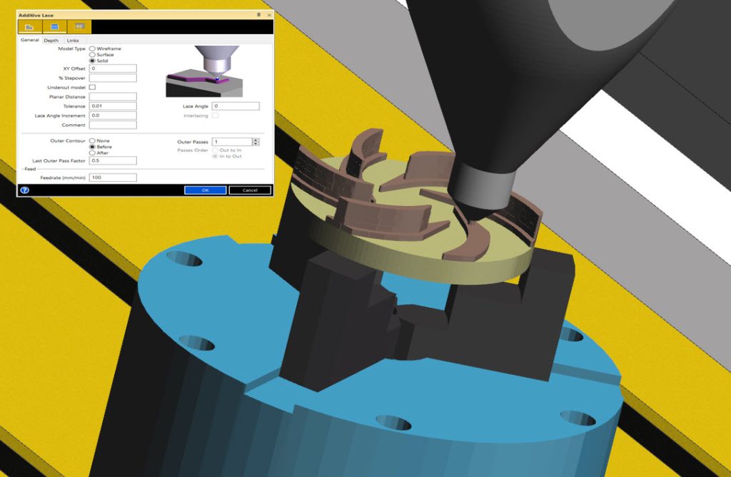 Edgecam Brand Manager John Buehler says the new Additive Lace cycle is designed to construct geometry on a layer-by-layer basis, depositing a continuous molten bead of material which adheres to the parent material. "Using the same intuitive dialog interface as all other Edgecam cycles, Additive Lace not only offers the ability to work with various CAD entities, but also empowers the user to determine numerous control types, such as lace angle, amount of finish passes, and undercut mode."