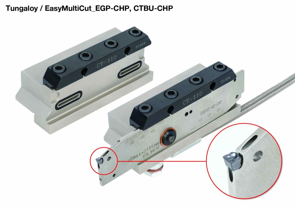 Tungaloy Corp. announces the expansion for EasyMultiCut: the EGP-CHP blade and the CTBU-CHP block, both of which respectively have a coolant hole for high-pressure internal coolant supply. EasyMultiCut is the multi-functional tool series for grooving, featuring a unique self-clamping insert that increases tool rigidity.