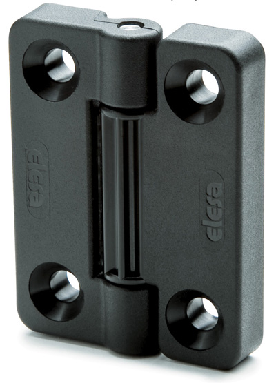 This hinge has been tested with more than 20,000 opening and closing cycles, and the value of the resistant torque was unchanged. Hinges are made of matte black glass fiber reinforced plastic (Polyamide PA), with hinge pin of stainless steel, European Standard No. 1.4305 (American Standard Series 303). They are offered in two types: 2x2 bore for DIN 7991-M6 countersunk screws, and 2x2 bore for ISO 4014-M6 countersunk screws.