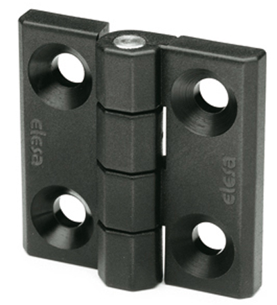 Hinge body is made of matte black glass fiber reinforced plastic (Polyamide PA). Hinge pin is stainless steel. Threaded studs are made of nickel-plated steel. Various metric and inch size fasteners and kit packaging are available upon request.
