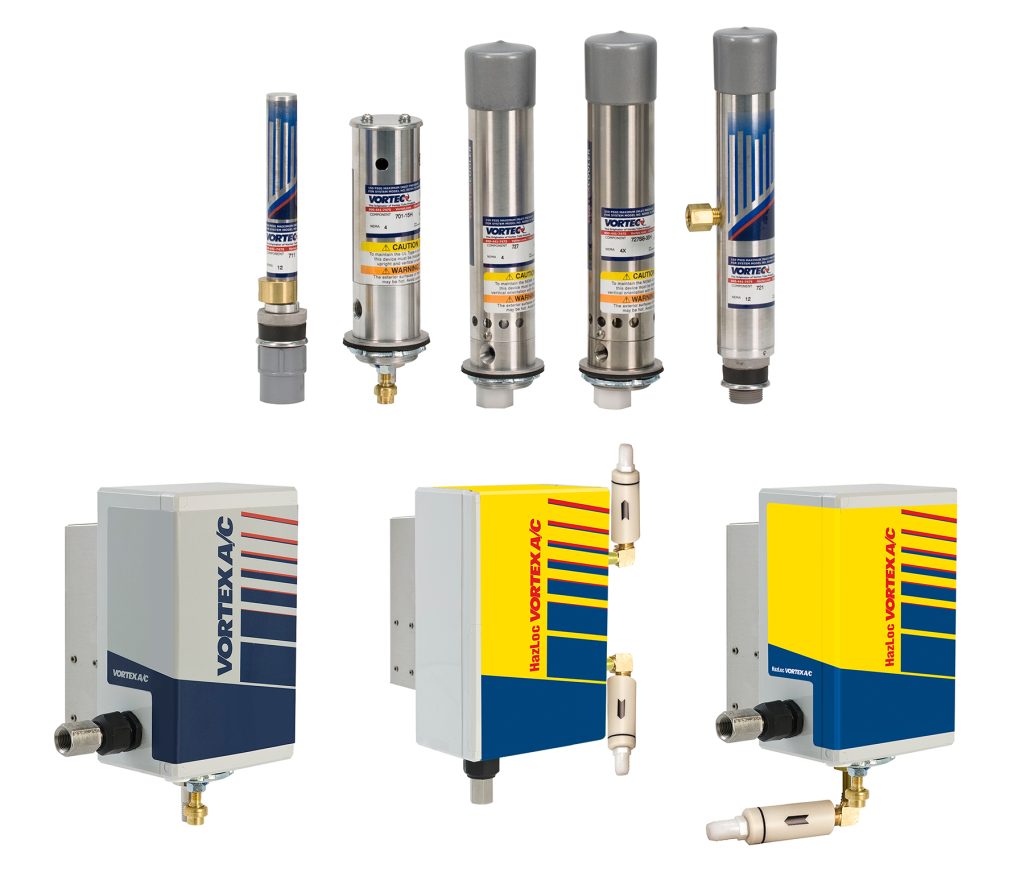 Increased temperatures which signal the start of spring are welcomed by workers—but can wreak havoc with sensitive electronics. As ambient temperatures rise, so does the temperature inside of electrical enclosures, causing problems for sensitive components like sensors, solenoids, relays and PLCs . Vortec enclosure coolers keep electrical and electronic enclosures cool, clean and dry, and are a low-cost alternative to expensive high-maintenance air conditioners. A small mounting footprint allows use in confined spaces, and require 1/10th the space of comparable air conditioner units. Various easy-to-install models available from 400 to 5,000 Btu with air consumption from 8 SCFM to 70 SCFM. NEMA 12, NEMA 4, NEMA 4X, Zone 2 & 22 and Class I, II, III, Div 2 ratings available.