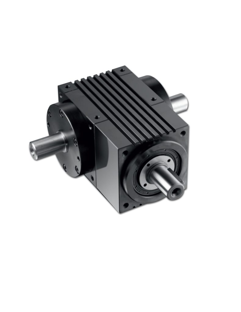 The single-component steel housings for these bevel gearboxes feature mounting threads on all sides to ensure stable attachment in a variety of installation positions. The heavy-duty bevel gears inside these housings offer high-transmission precision and reduced stress on the bearings. A friction-locked, zero backlash connection of the crown gears on the drive shaft reduces the mass of the gearing component.