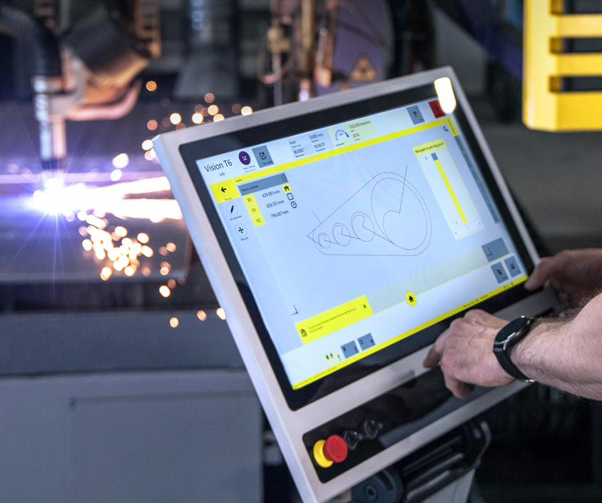 The Vision T6 features a multi-touch, high-definition panel with a Windows operating system. The Vision includes features such as swipe-to-zoom, drag-and-drop, and a familiar home button. The home button gives quick and easy access to a full range of features and capabilities, letting operators select and edit programs, create nests, locate parts on a plate, and cut, the company says.