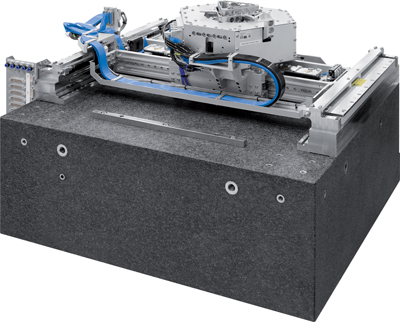 The standard XYZT Planar Platform mounts an ETEL ZT Combined Module on the gantry beam of the XY stage. The ZT Combined Module provides infinite Theta rotation and dual Z-axes: a coarse Z axis for wafer loading and unloading, and a fine Z axis for focus adjustment. This module can be replaced to best suit the needs of an application, whether that application requires only Z motion, pure Theta motion, or ZT motion with tip/tilt correction. The stroke of the X and Y axes can be adjusted to accommodate a 300mm or 450mm wafer, and even longer strokes are also available. The platform can also be integrated with ETEL's QuiET Active Isolation System to further improve system performance.